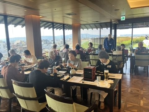 通る裏道を選んでホテルまで歩き、ランチ前の有意義なウォーキングとなりました。正午に日本料理店「花菊」の会場で「交流ランチ会」をスタート。人気の万葉弁当を美味しく頂きながら、外の景色を楽しみ、談笑を重ね、一同は満足一杯の至福のひとときを過ごしました。
